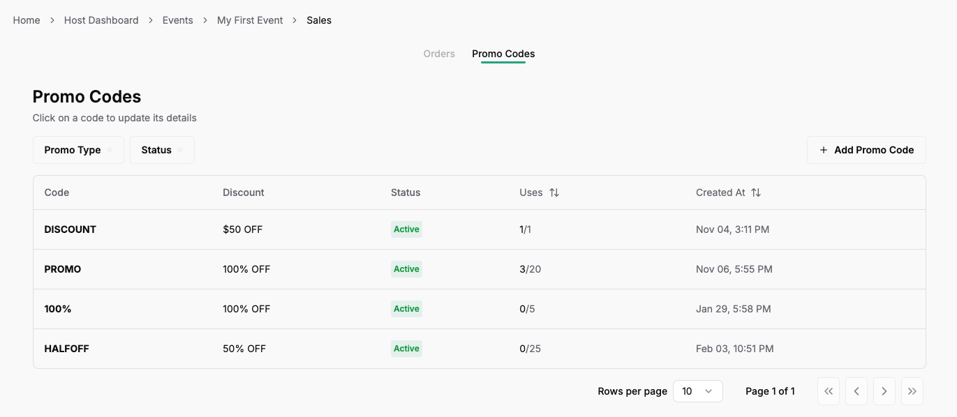 In the Sales page, select the “Promo Codes” to manage all your promo codes for that event